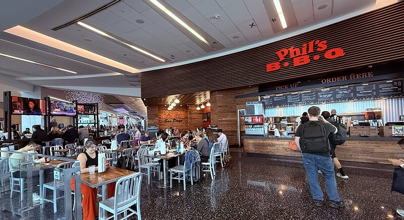 This local chain earned its following long before opening at the airport. At SAN, it brings tri-tip sandwiches, BBQ chicken, and coleslaw straight to travelers who want big portions and dependable flavor. The meat is slow-cooked, and the line moves fast. It’s a solid choice when craving something heavy before takeoff.