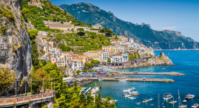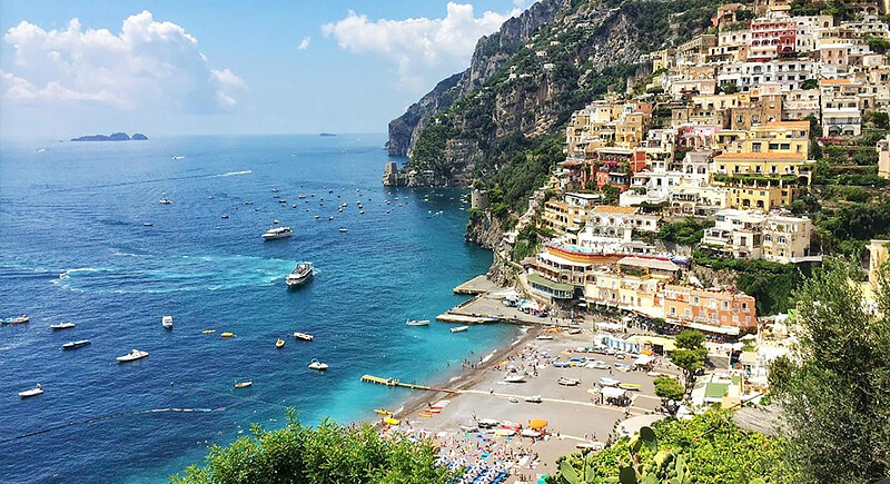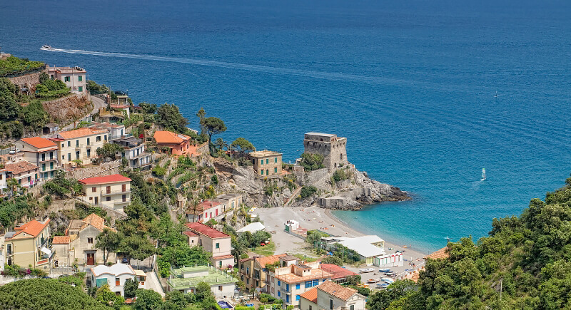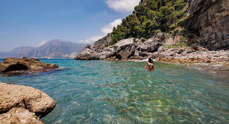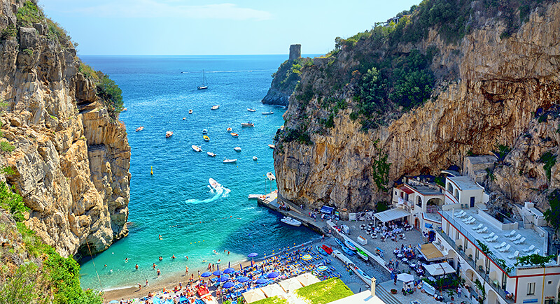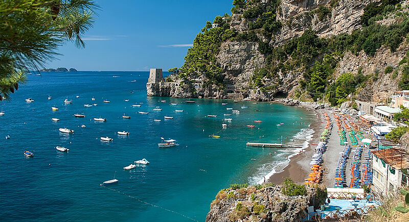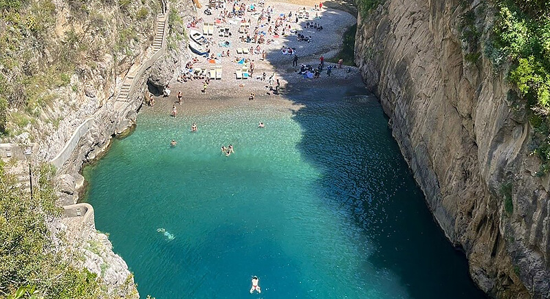 Gavitella is one of the few beaches on the Amalfi Coast where the view stretches across the water toward Capri and Positano, which makes it a favorite place for sunset swims. The shore is built on rocks and platforms instead of sand, and many people stop at the beach clubs for cold drinks and cliffside views. The climb back up takes effort, but the setting at the bottom feels special enough that most visitors say it’s worth every step.