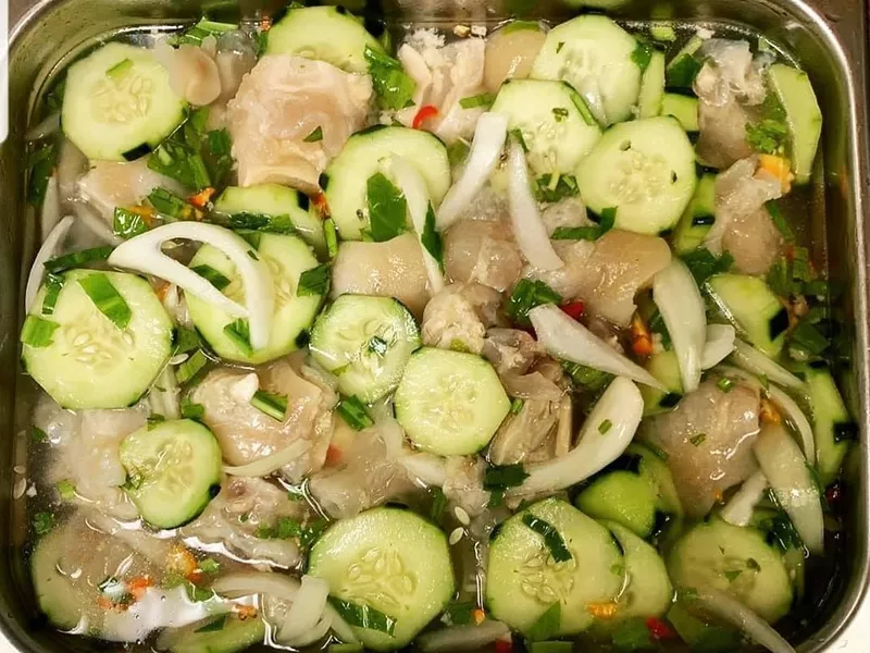 The meat is cooked until tender, then marinated in a special concoction of vinegar, lime juice, spices, herbs and vegetables.