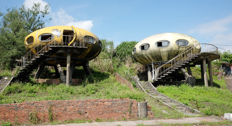 After officials demolished the larger Sanzhi UFO housing project in 2010, only a few Futuro-style pods like these in Wanli stood. Constructed in the 1970s, they were part of a failed resort plan aimed at U.S. military personnel. Their spaceship-like design still draws attention, even as the structures remain weathered and empty.