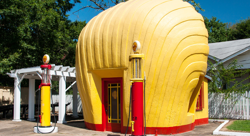 Built in the 1930s by the Quality Oil Company, this Shell station in Winston-Salem was one of eight shaped like a scallop shell to promote the Shell brand. The design followed a short-lived trend of novelty architecture meant to draw drivers off the road. It’s the only one left and serves as a roadside landmark.